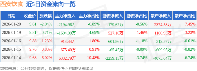 证券之星动静,截至2026年1月20日收盘,西安饮食(000721)报收于9。61元,换手率6。43%,成交量32。92万手,成交额3。19亿元。