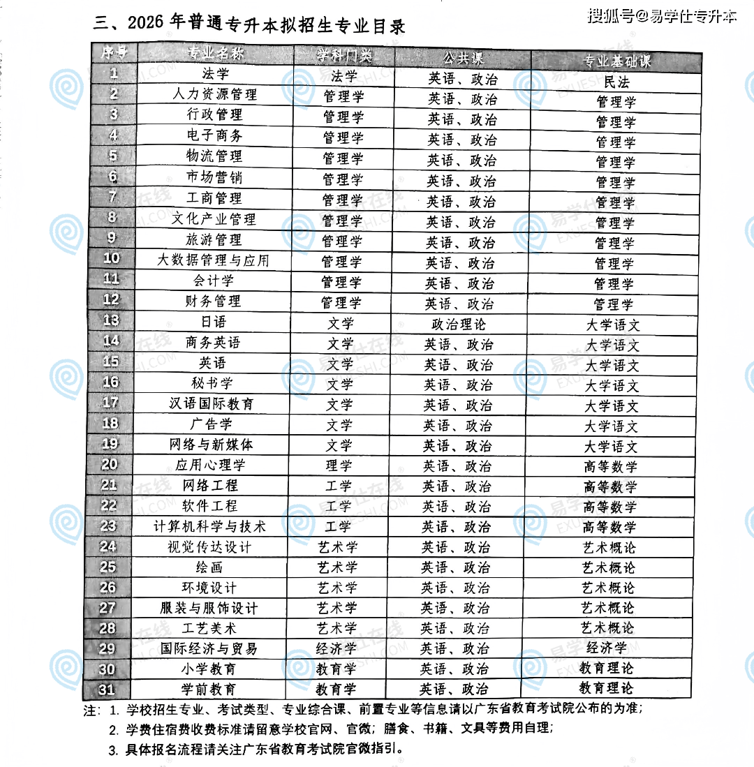 2026年广东专升本政策发布时间,估计正在11月下旬,目前各院校连续起头透露2026年专升本的招生专业环境,下方做了汇总拾掇,同窗们能够参考。2026年通俗专升本(统考)拟招生专业共15个。拟新增招生专业3个:数字手艺、大数据办理取使用、数字艺术。