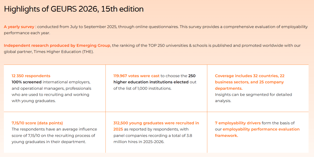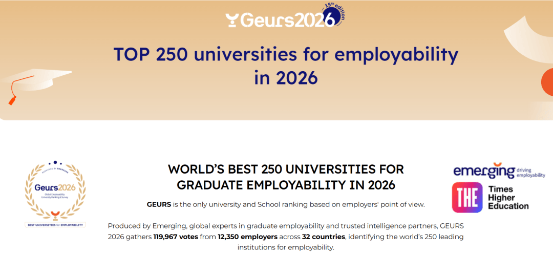 全球就业能力大学排名和查询拜访(GEURS)是国际雇从高度承认的权势巨子排名系统,自2019年以来已成为其征询量最大的排名。